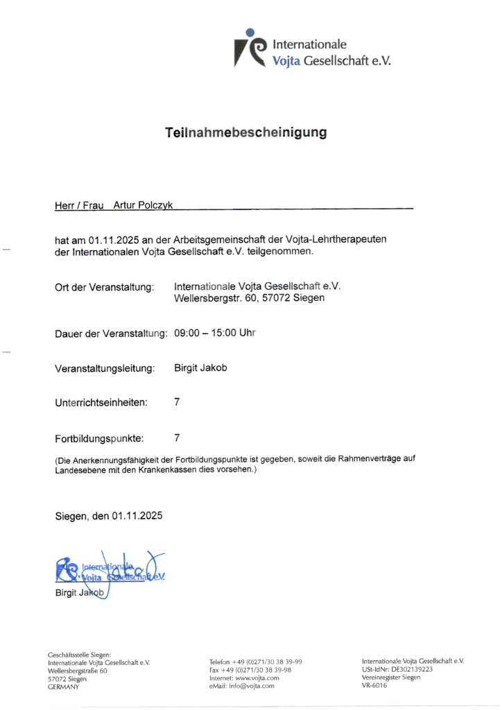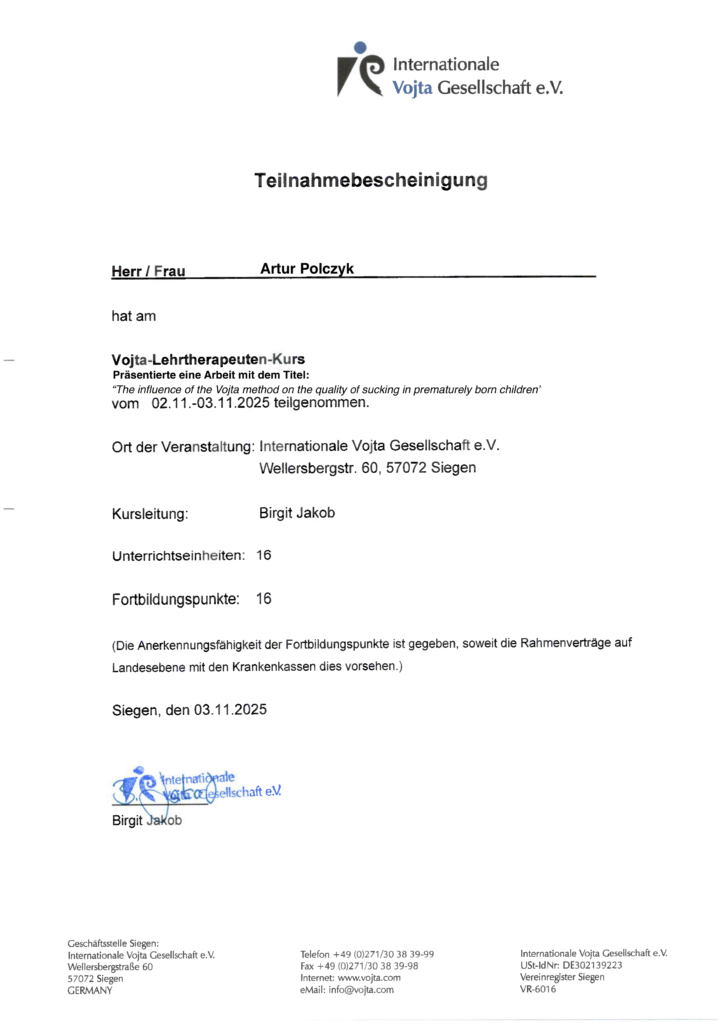 W dniach 30.10-03.11.2025 Uczestniczyłem w międzynarodowym zjeździe instruktorów i nauczycieli metody Vojty w Siegen, gdzie wraz z Anną Fonfarą wygłosiłem pracę „Wpływ odruchowej lokomocji na poprawę jakości ssania u dzieci urodzonych przedwcześnie”.