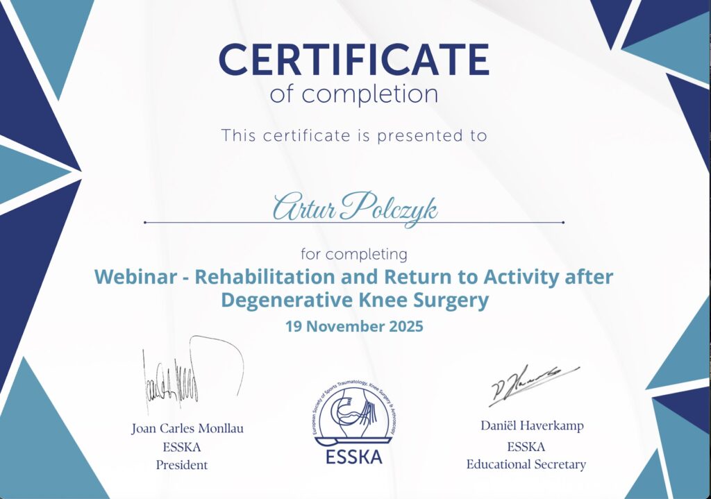 W dniu 19.11.2025 wziąłem udział w seminarium poświęconemu pre i postoperacyjnemu postępowaniu fizjoterapeutycznemu u osób po artroskopii stawu kolanowego.